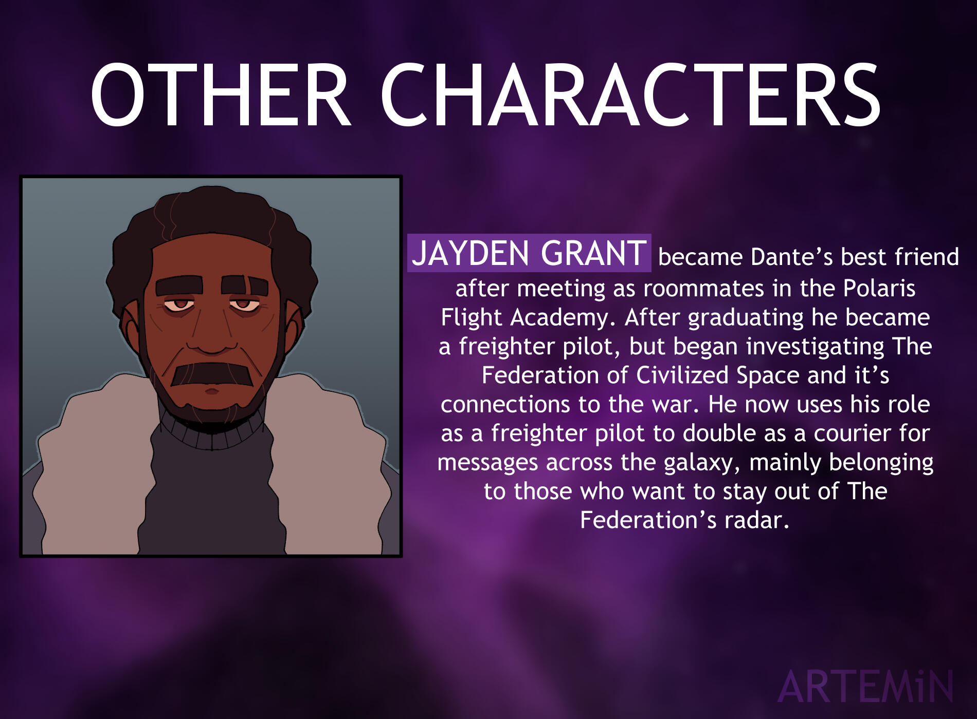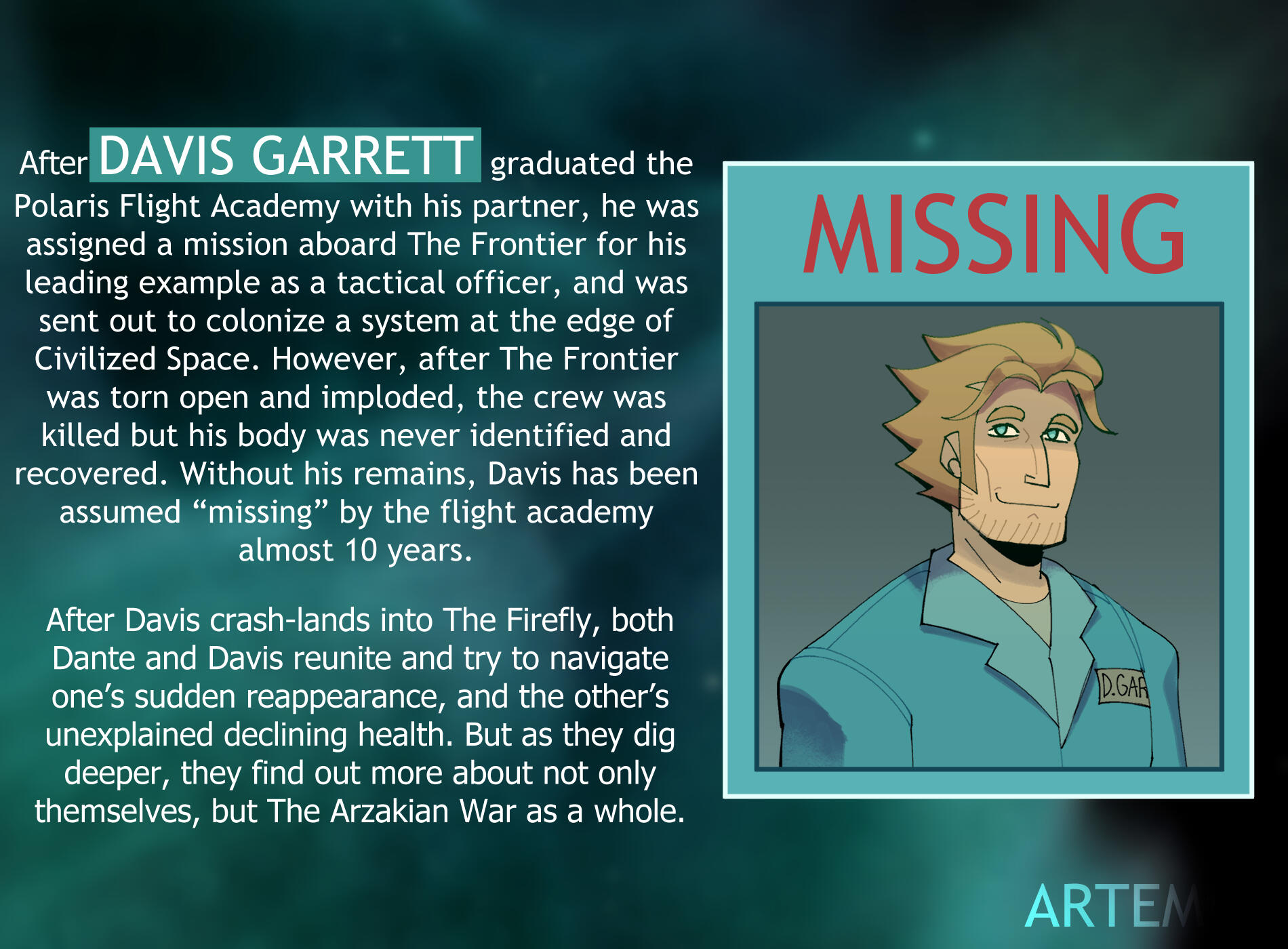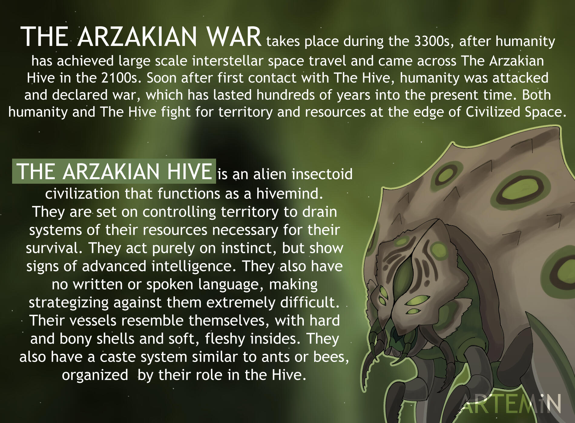The Arzakian War is my newest webcomic, and is the one I am currently working on. It takes place in the 3300s during the interstellar age, where humanity is actively fighting an alien hivemind named the Arzakian Hive.This series is available to read on Tapas!The general premise can be read below.